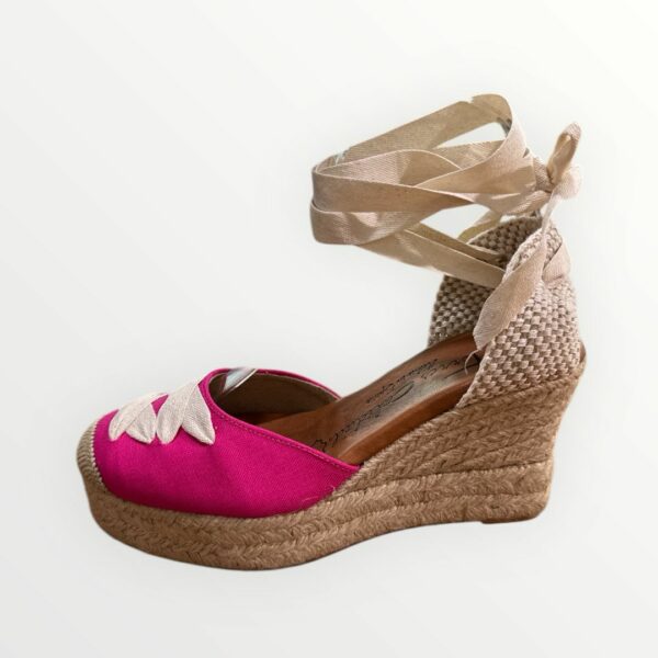 Punta de tejido fucsia con detalles de cintas cruzadas.